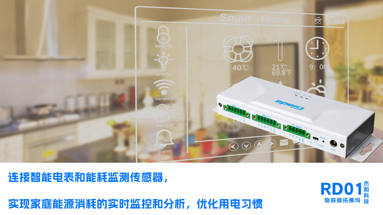 RD01连接智能电表和能耗监测传感器,实现家庭能源消耗的实时监控和分析,优化用电习惯,整合门禁传感器、窗户传感器和运动探测器,一旦检测到异常行为,立即触发警报并通知用户。