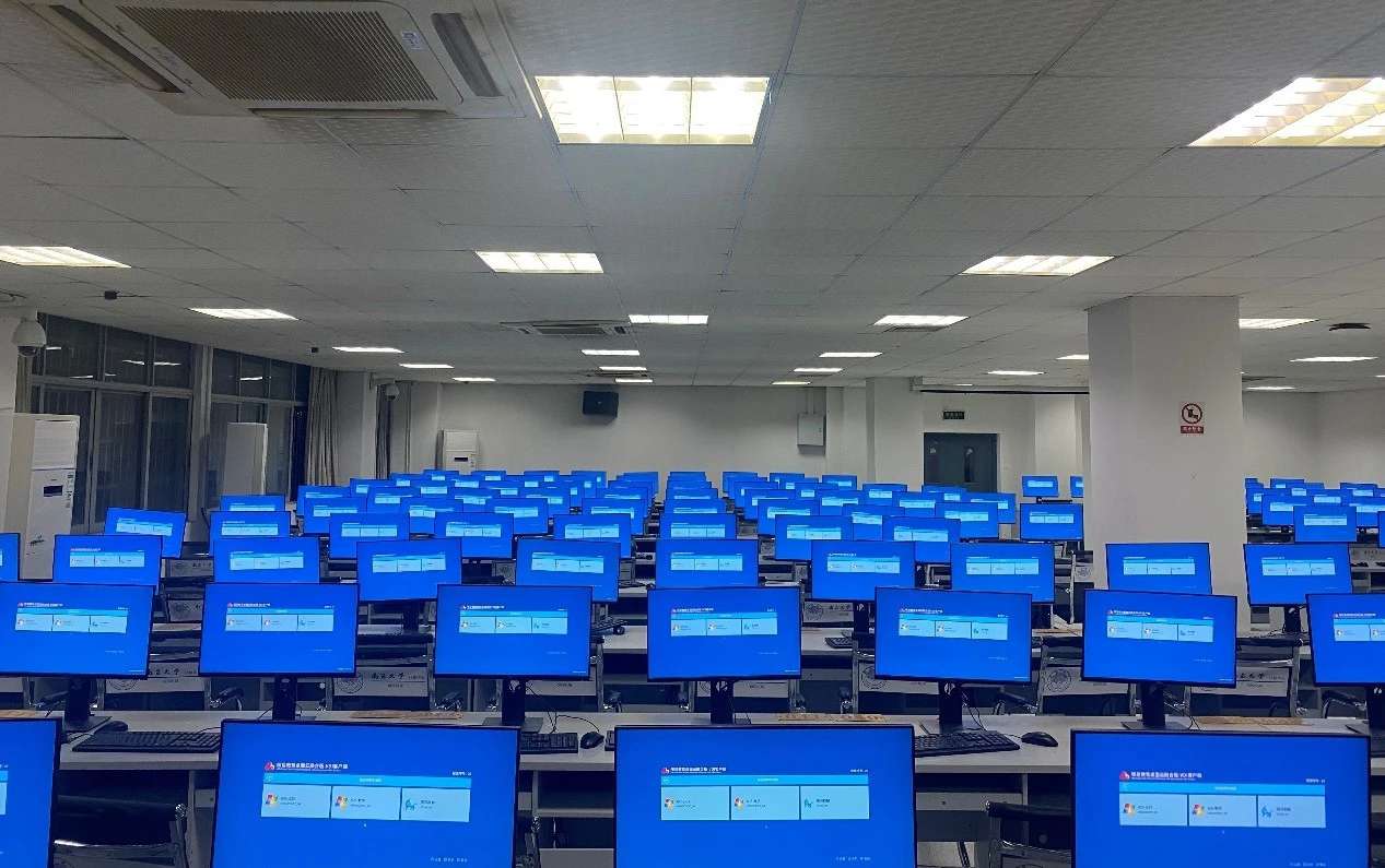 在某大学实训室,整齐的电脑屏后面是统一的杰和科技云终端主机,老师在讲台上通过电脑端的管理软件,轻松地将教学资料推送到学生的终端上,每位学生的电脑屏幕一致会出现同个页面。