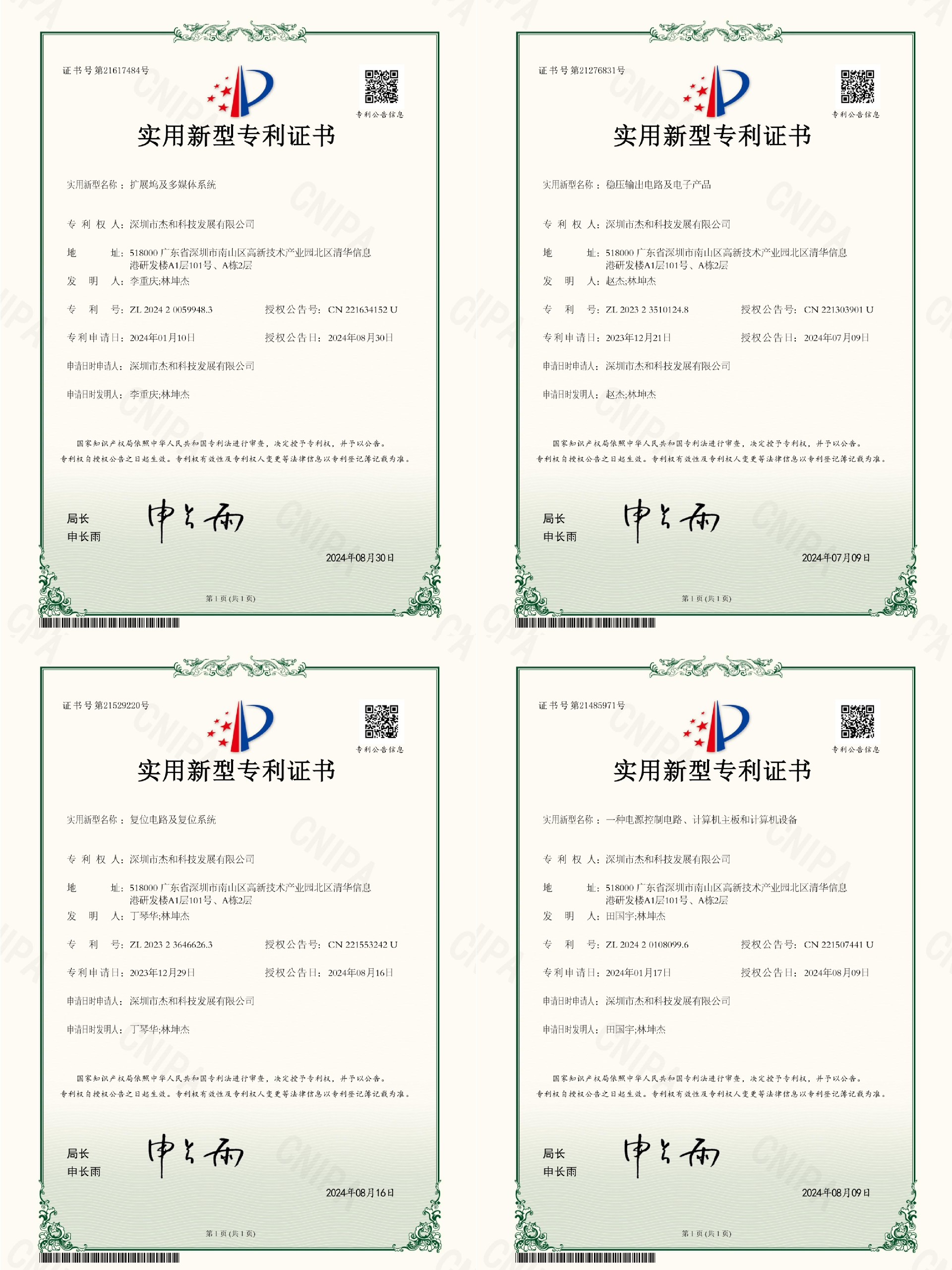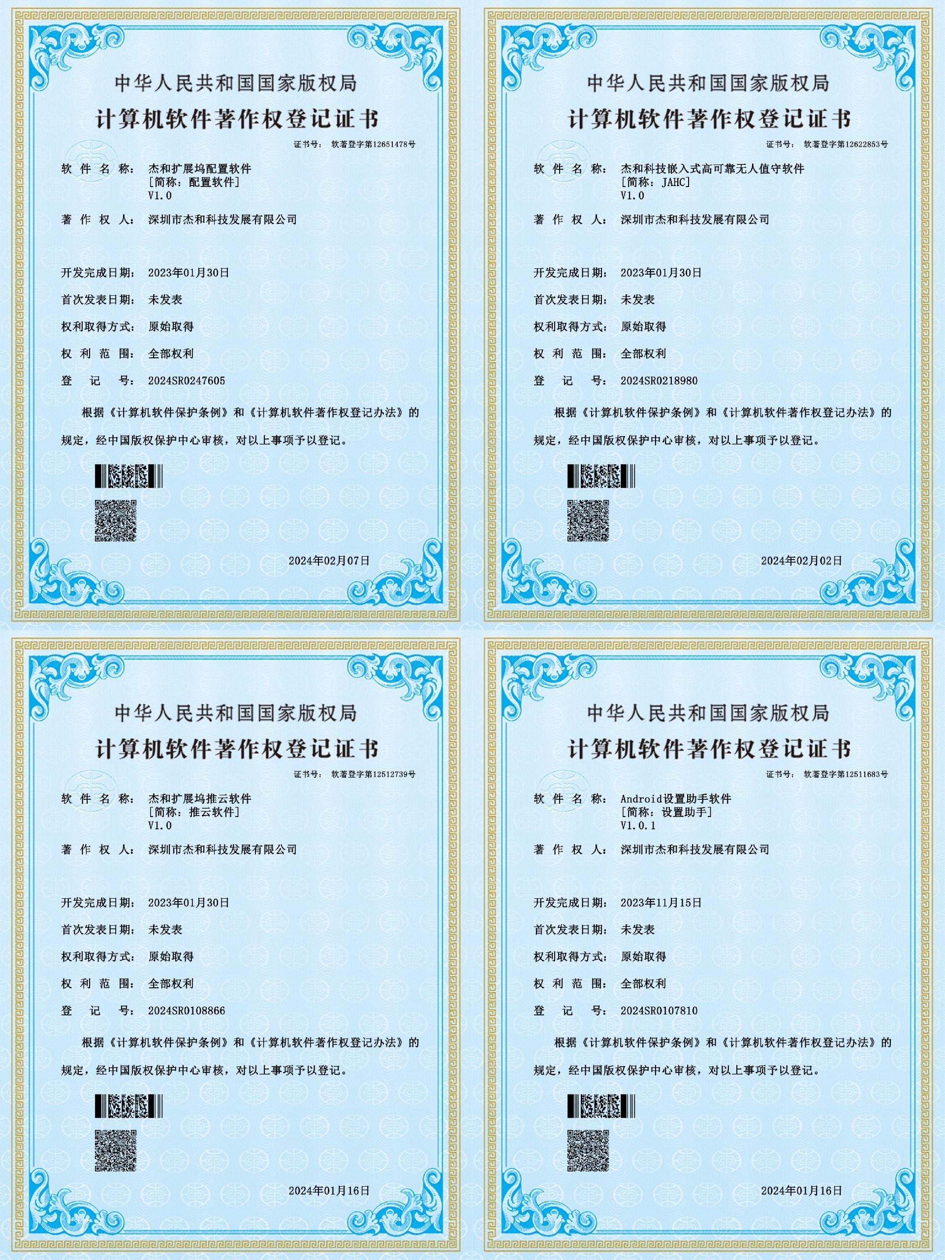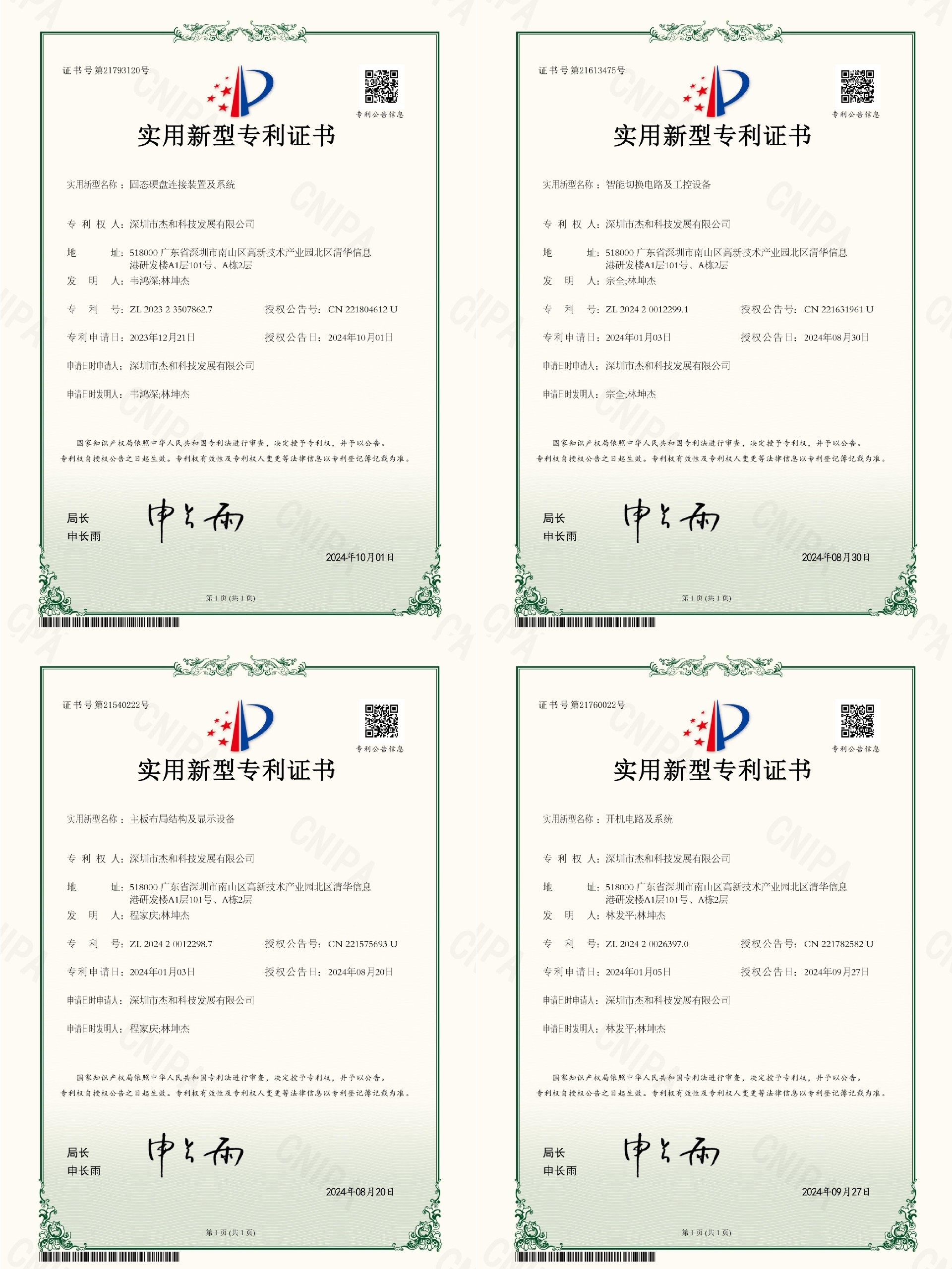 在科技创新的道路上,杰和科技从未停止前进的脚步。截至2024年10月,杰和科技今年在科研上取得了显著成就。今年我们共荣获10项实用新型专利,2项外观设计专利,取得4项软件著作权,还有5项发明公开待授权。