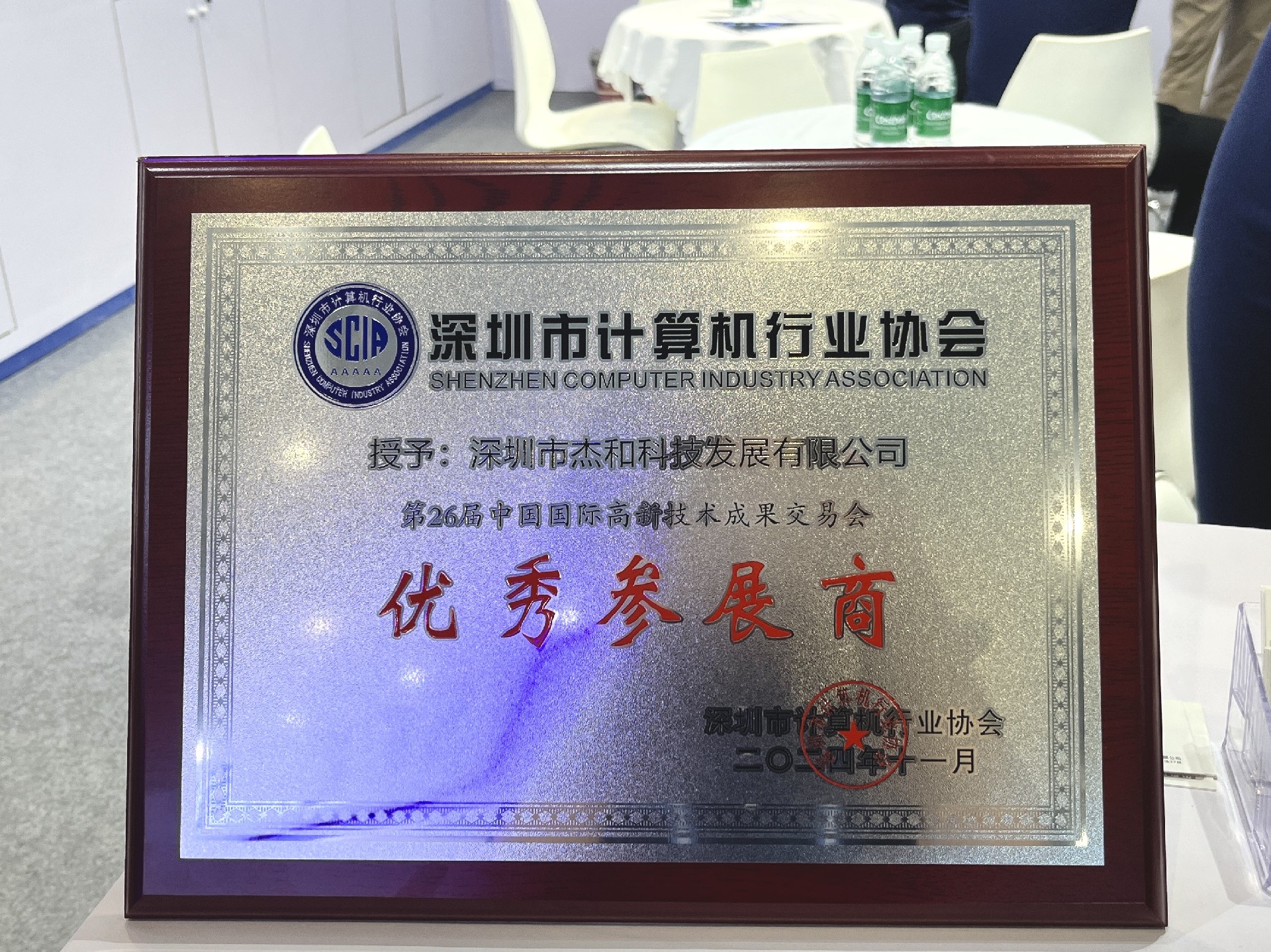 除了客户的关注,杰和科技在本次高交会上还获得了行业的认可,凭借创新能力和技术实力,成功荣获第26届中国国际高新技术成果交易会“优秀参展商”称号。