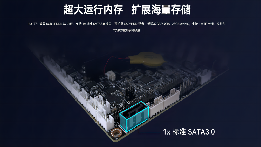 IB3-771板载8GB LPDDR4内存,支持1x标准SATA3.0接口,可扩展SSD/HDD硬盘,板载32GB/64GB/128GB eMMC,支持1xTF卡槽,多种形式轻松增加存储容量。