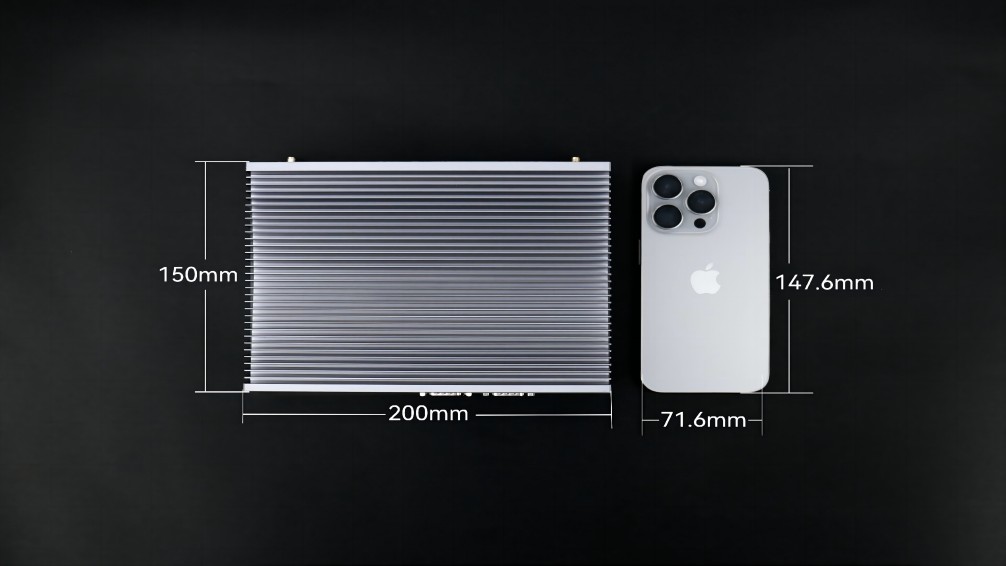 没有了风扇这一部件,体积也更为小巧,能轻松嵌入各类设备或狭小空间,完美贴合特定场景需求,例如:杰和AE613,其三围尺寸是200mm x 150mm x 50mm,与iphone15的尺寸对比,宽度仅比其高度多2.4毫米,体积仅有1.5L。