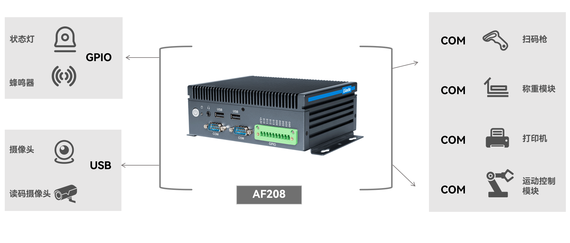 杰和科技工业整机 AF208 满足分拣信息系统对主控设备在数据处理、存储与传输方面的高性能需求: