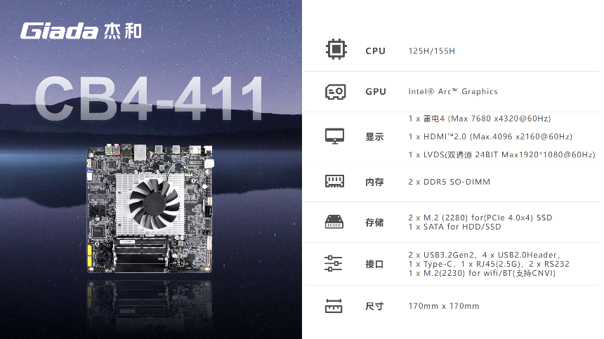 对于追求强大AI算力需求的用户而言,杰和科技的 CB4-411 主板堪称不二之选。这款主板可搭载Ultra5、Ultra7、Ultra9H系列处理器,这些处理器以卓越的性能和能效,为各种计算任务提供了强大的支持。它能够让用户直接在电脑上高效处理AI工作,在图像识别、图形渲染、视频编辑等任务中表现卓越。