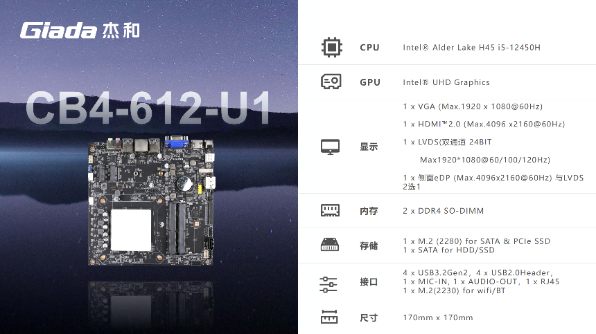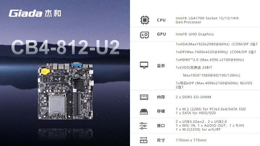 杰和科技一体机主板基于X86架构设计,具有良好的兼容性与性能表现,均采用Thin mini-ITX 170mm*170mm尺寸规格设计,在紧凑机身中实现功能集成与空间优化。接下来,我们从实际需求出发,为您提供选型推荐。