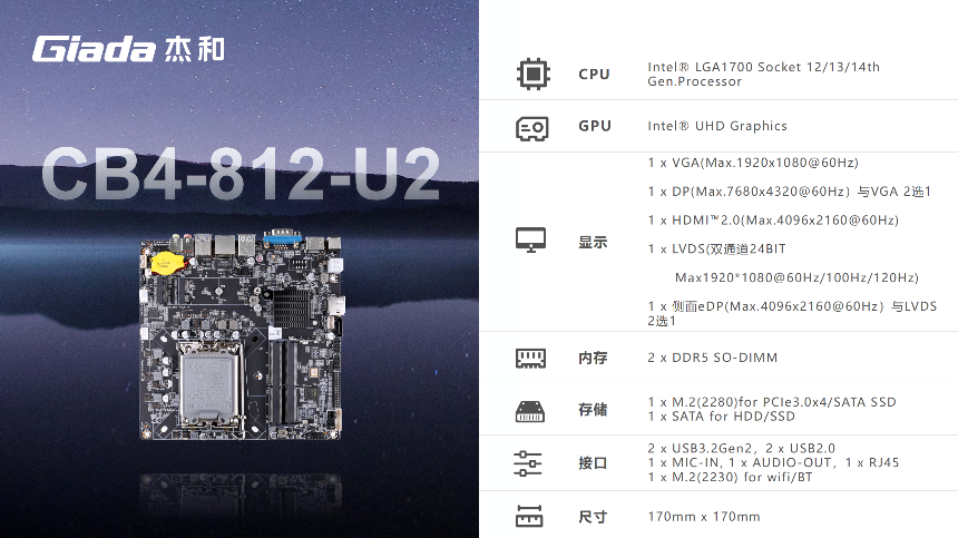 针对大内存需求场景,杰和科技商用一体机主板凭借X86架构与Thin-mini规格的技术融合,对一体机主板CB4-612-U1、CB4-812-U1进行改良升级,商用一体机推出了首搭DDR5内存的CB4-612-U2、CB4-812-U2主板。