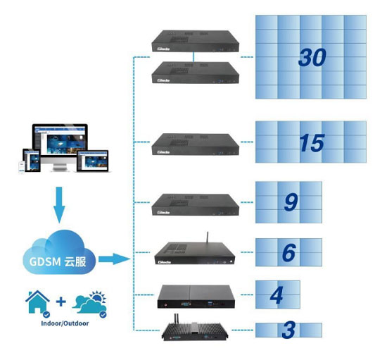 与常规分屏展示方案不同,在杰和拼接控制器的视频输出能力和GDSM系统分组设置能力的组合下,店铺可以随时调整的拼接放置样式;快速设置屏幕的拼接、分组方式;快速编辑制作并发布信息;是一套安装部署迅速、内容调整迅速、更新反馈迅速的一体化信息发布方案。