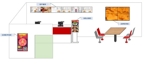 品牌信息墙分为一组由杰和科技G468四屏拼接控制器控制的4块LCD高清液晶显示屏,可以实现大画面播放及单屏独立播放。内容管理者可通过GDSM系统操作端随时更新菜单内容及新品广告,让信息的发布更为及时有效。