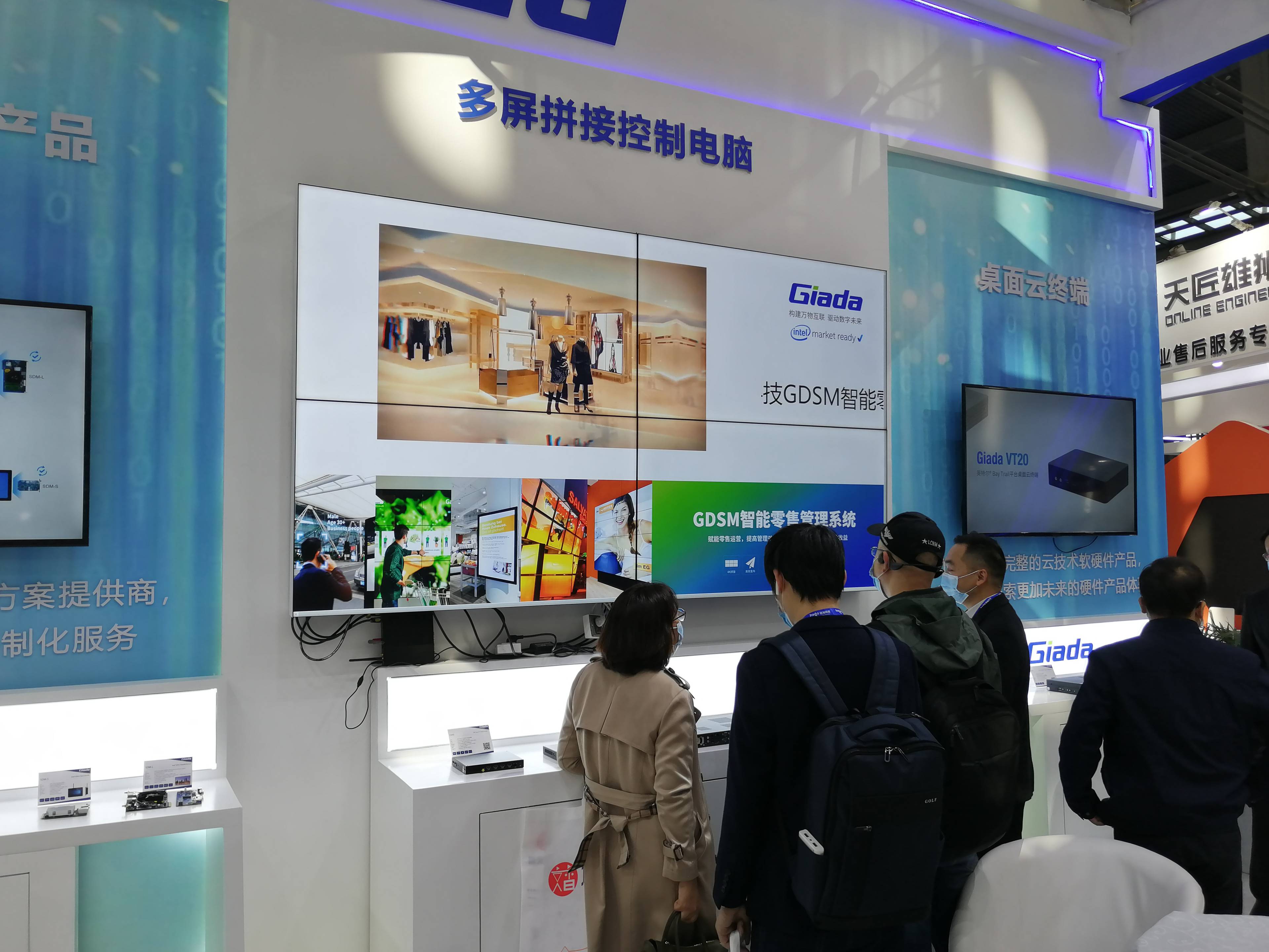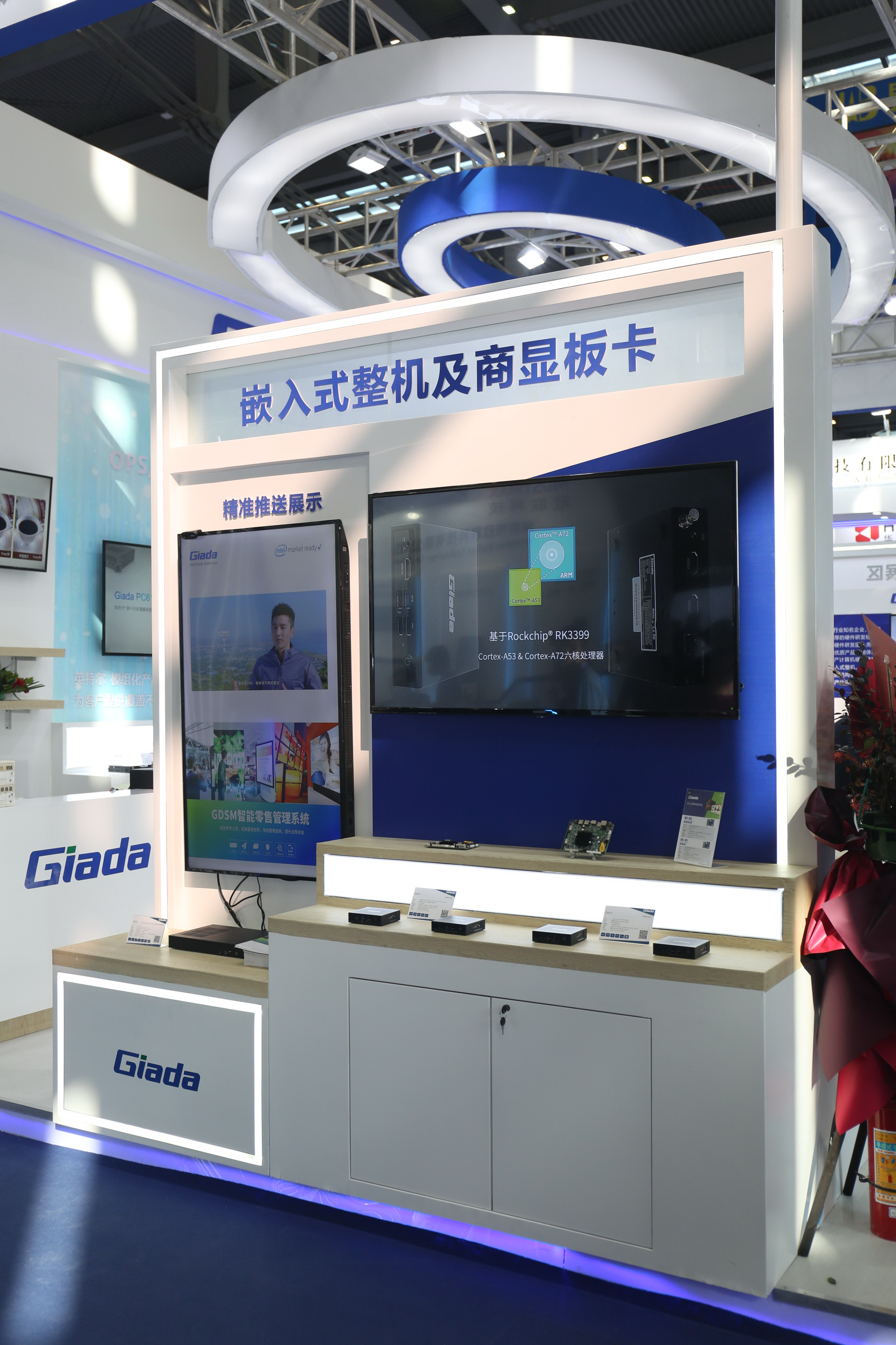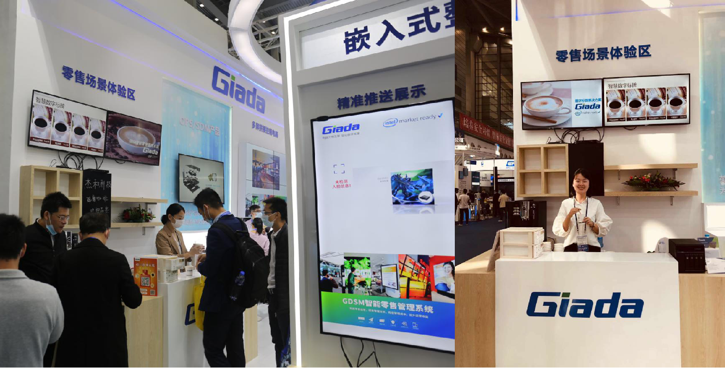 紧邻ARM架构商显产品集的精准推送展示区与零售门店模拟展区,共同组成了本届展会杰和科技展位的一大精彩设计。场景展现了GDSM智能零售管理系统在零售门店场景下的展示效果,顶部的数字标牌由GDSM系统推送内容,模拟搭建了针对人流动线的广告精准推送形态。