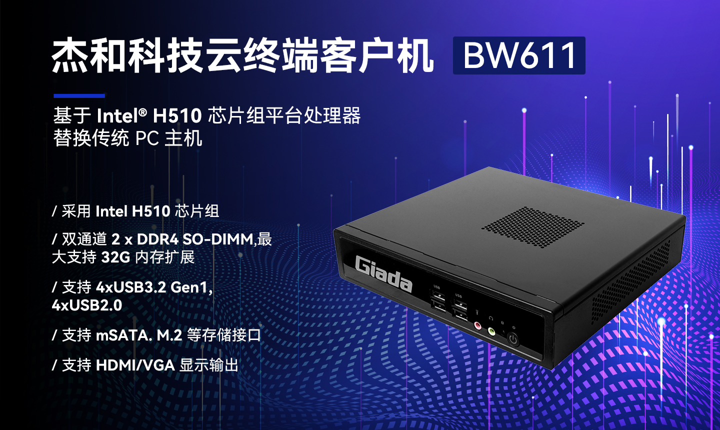 杰和科技云终端BW611体积小巧、双通道内存,性能强悍,接口丰富。
