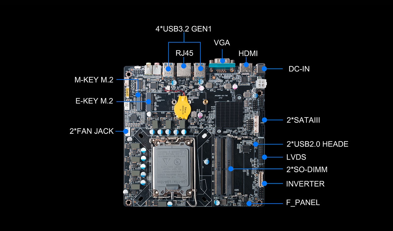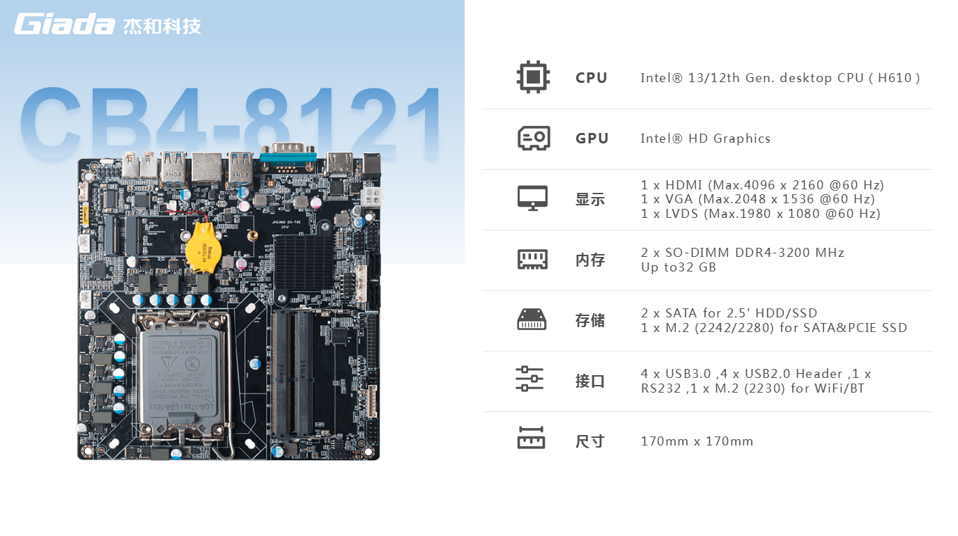 另外,一体机相对于传统的电脑更加美观,更加节能环保,而且一体机在使用体验方面也有独特的优势:比笔记本屏幕大,比台式机更简洁,也解决了一直为人诟病的台式机线缆多而杂的问题,因此,越来越多的教育办公、日常娱乐和学习的用户选择使用一体机。Giada杰和科技根据市场与客户需求,推出这款高性能的一体机专研主板CB4-8121,带来全新震撼体验。杰和科技主板CB4-8121是基于Thinmini ITX一体机标准设计,采用Intel Alder Lake-S平台H610芯片组,支持全新第13/12代Core i7/i5/i3处理器,搭载双通道SO-DIMM DDR4-3200MHz内存、1 x M-Key M.2 (2242/2280) SSD和 2 x SATAIII存储,强大的配置能够为用户带来出色的计算和图形处理性能,无论是载入游戏、数据传输还是平面设计,赋予用户更加极致流畅的使用体验。
