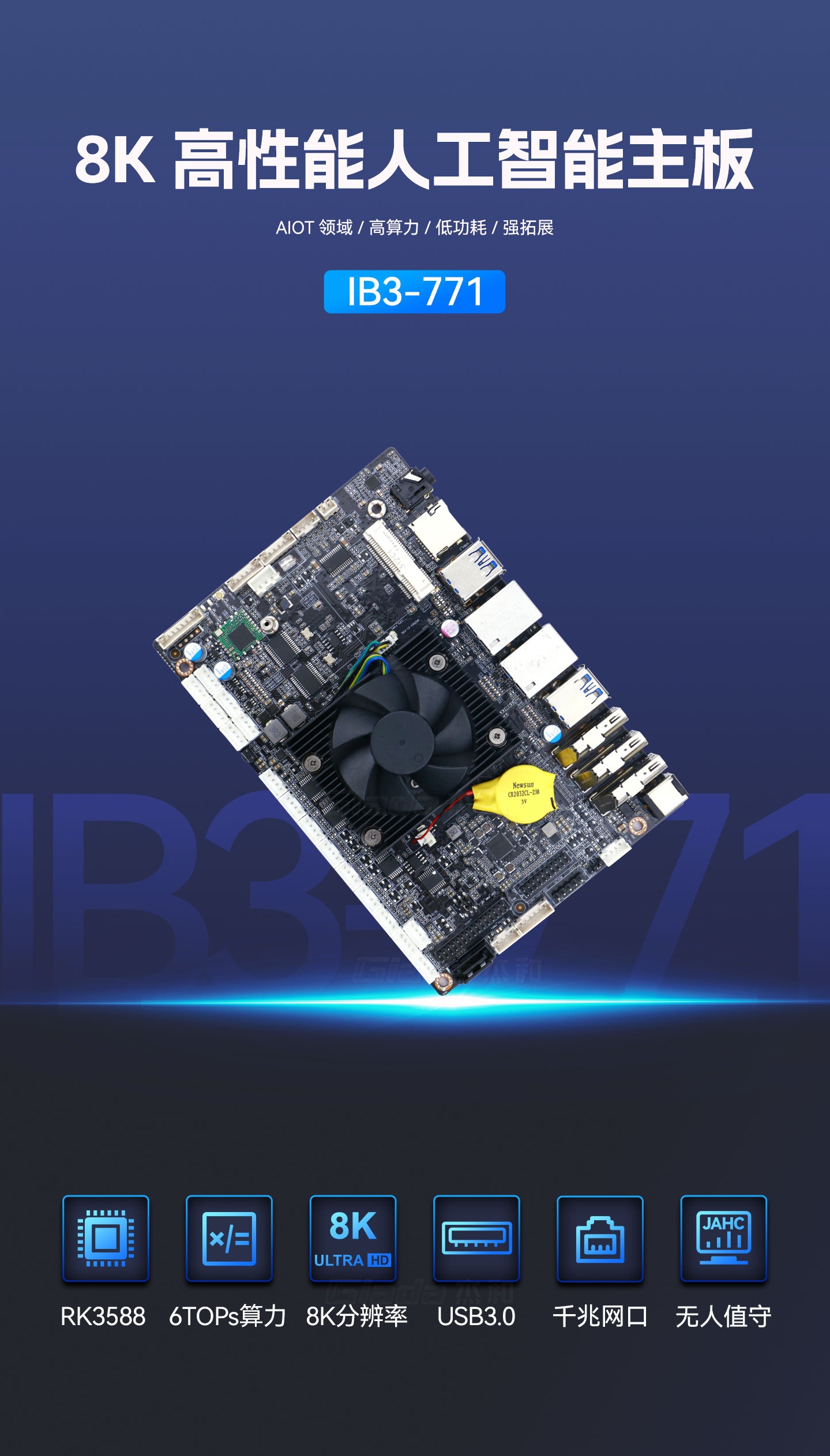 杰和科技IB3-771采用瑞芯微全新旗舰级芯片RK3588,搭载八核64位处理器,集成ARM Mali-G610 MP4 GPU,高算力、低功耗、具备强大的视觉处理能力;性能强悍的RK3588内置AI加速NPU,提供6TOPs算力,支持主流深度学习框架,为各类AIoT应用场景提供更优的性能表现。