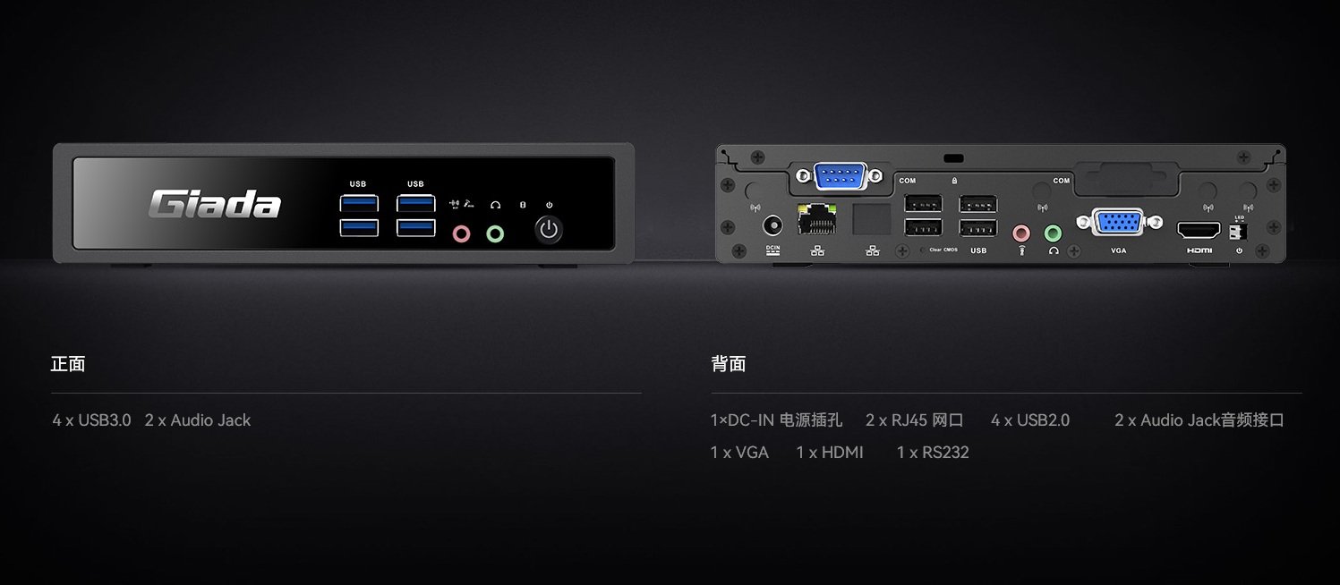 杰和云终端BW612机身背面配备四个USB2.0接口,两个3.5mm 音频接口,两个千兆网线接口,一个VGA和 HDMI 接口,兼容几乎全部主流外设,满足云终端全场景接口使用需求,同时正面配备两个3.5mm音频接口,四个USB3.0接口,满足即插即用的设备需求。