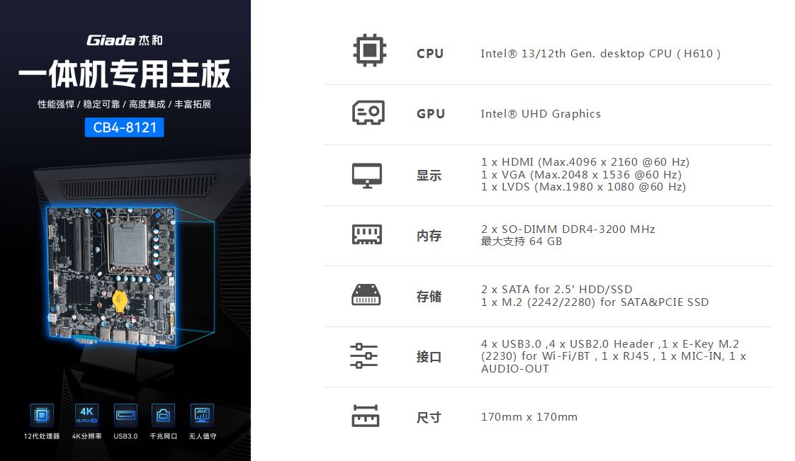 一体机在使用体验方面也有独特的优势:比笔记本屏幕大,比台式机更简洁,也解决了一直为人诟病的台式机线缆多而杂的问题,另外,随着计算机硬件和制造工艺的不断发展,一体机的性能也在不断提高,因此,越来越多的教育办公、日常娱乐和学习的用户选择使用一体机。Giada杰和科技根据市场与客户需求,推出这款高性能的一体机专研主板CB4-8121,带来全新震撼体验。