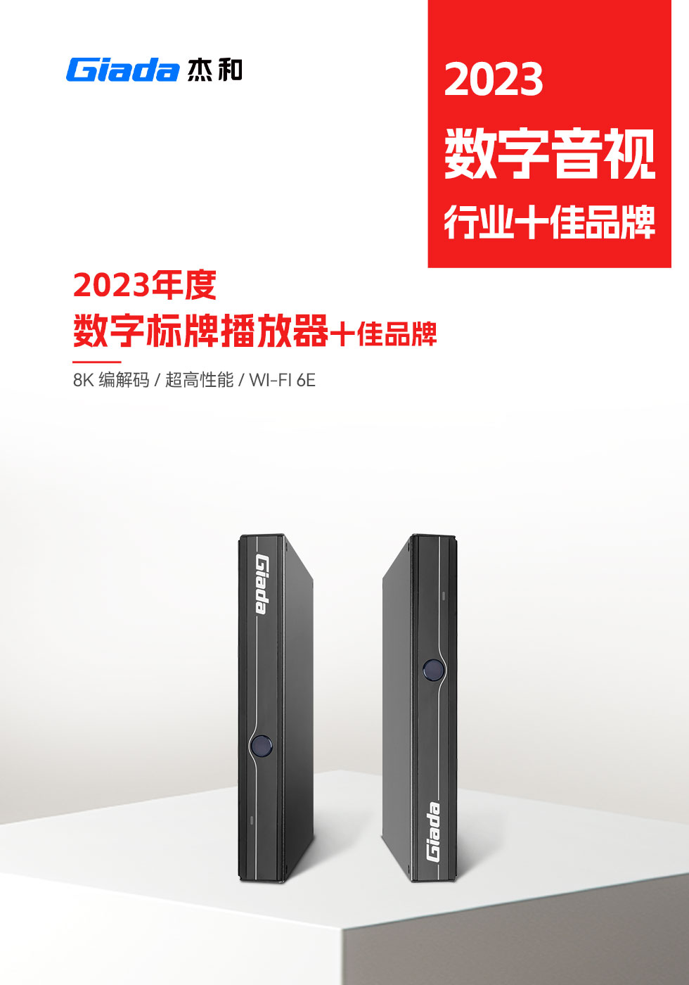 2023年接近尾声,新旧更替之际,第15届DAV数字音视工程网“数字音视行业十佳品牌评选活动”获奖名单新鲜出炉。杰和科技在此次评选活动中,荣获“2023年度商显主板十佳品牌”、“2023年度数字标牌播放器十佳品牌”两项大奖,Giada杰和科技已连续四年登上同一榜单。