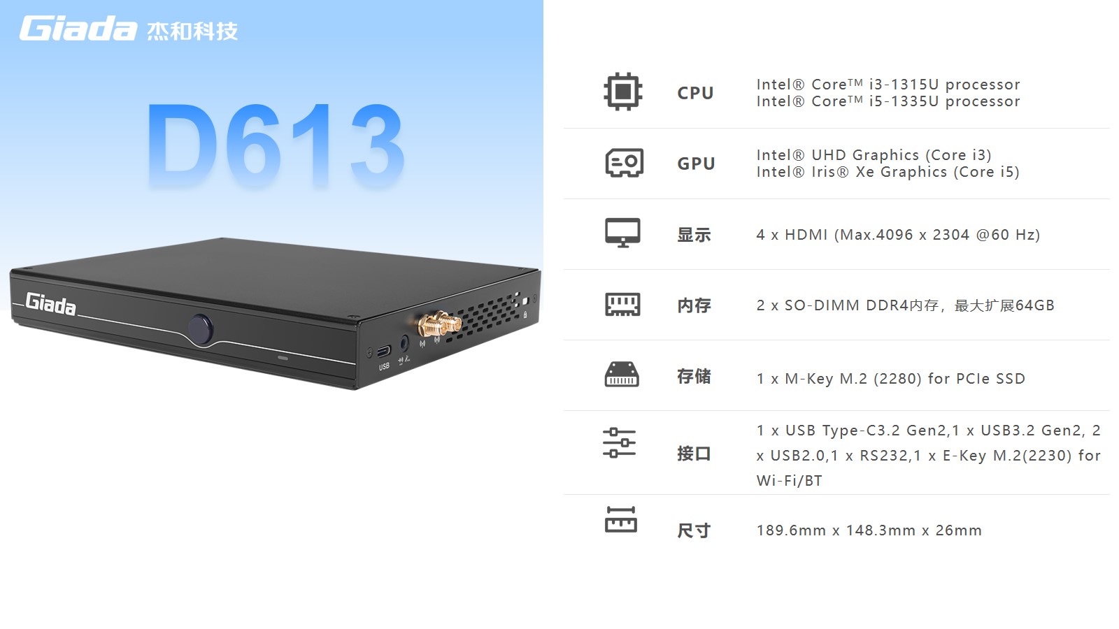 杰和数字标牌D613搭载Intel RaptorLake Corei3-1315U/i5-1335U处理器,可以同时连接4个4K显示器,支持4K分辨率编码解码,还支持5G蜂窝网络,速度比4G LTE快10倍。