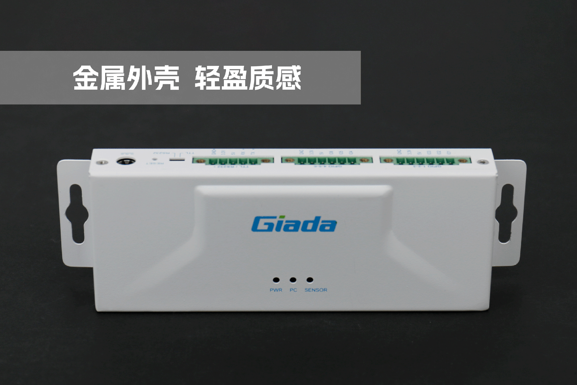 杰和物联网拓展坞RD01外部为白色,顶部印制杰和Giada的彩色logo,外壳采用金属材质,左右两侧设计同材质挂耳,可以方便用户固定设备。