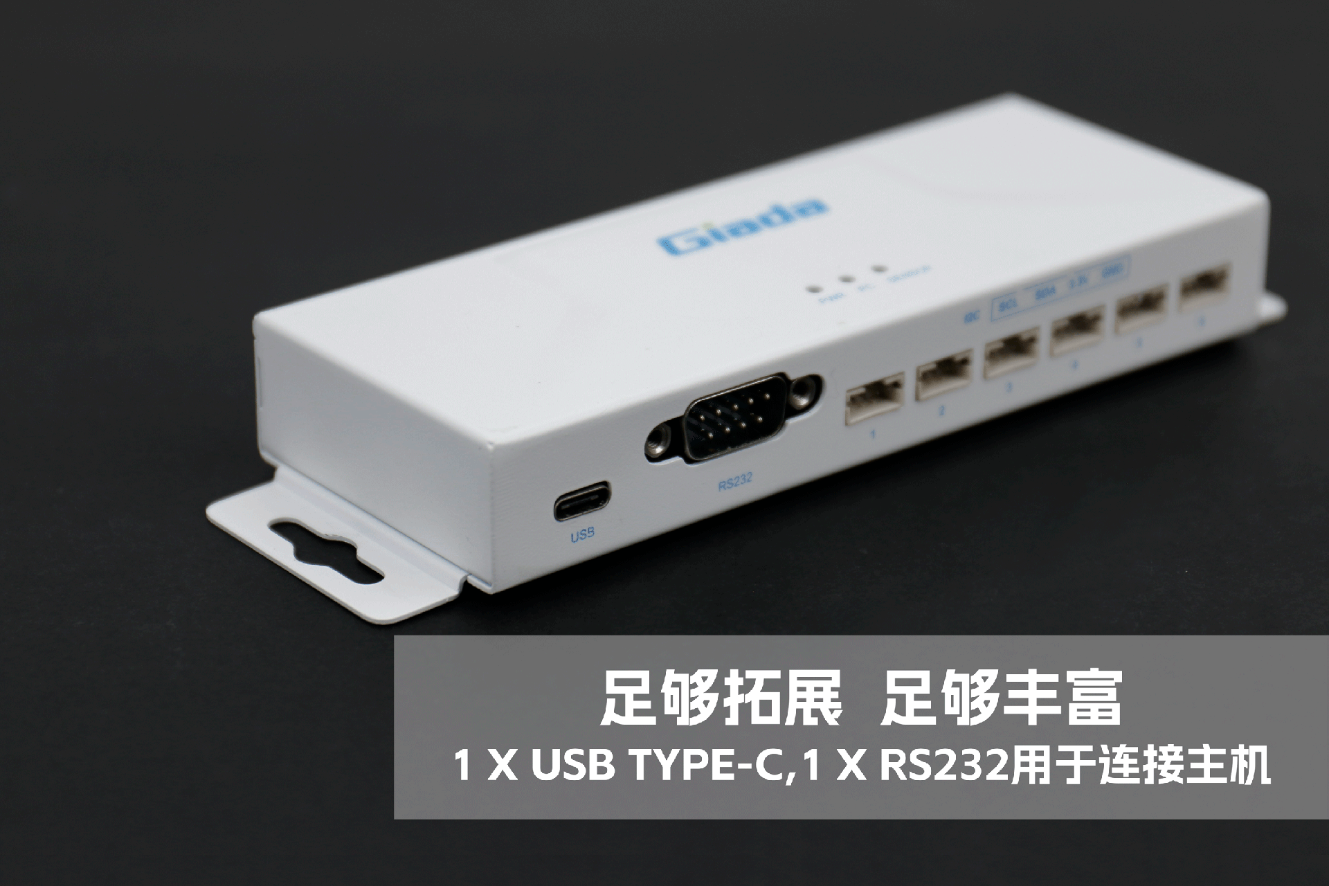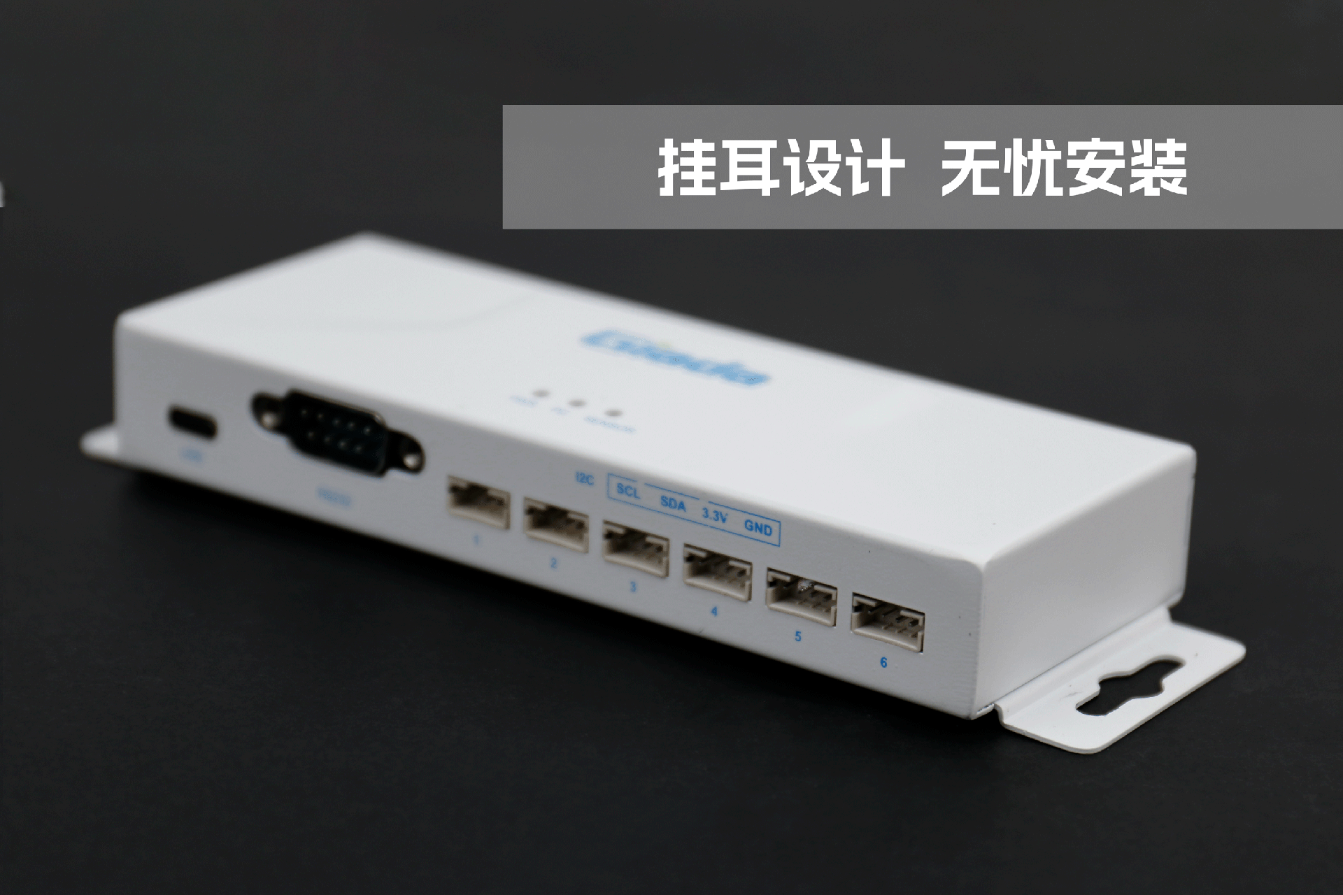 杰和RD01接口丰富,正面配备1个USB Type-C,用来与媒体播放器通信(USB串口)和供电;1个RS232 串口,采用 DB9 端子,支持 DTS 和 CTS 信号,可用来与媒体播放器通信;6个I2C接口,采用6组HY2.0-4PIN端子,用于与传感器通信。在顶部设置3个LED 灯,用于状态指示,LED1通电显示蓝色,LED2与媒体播放器通讯闪烁绿色,LED3与传感器通讯闪烁绿色。