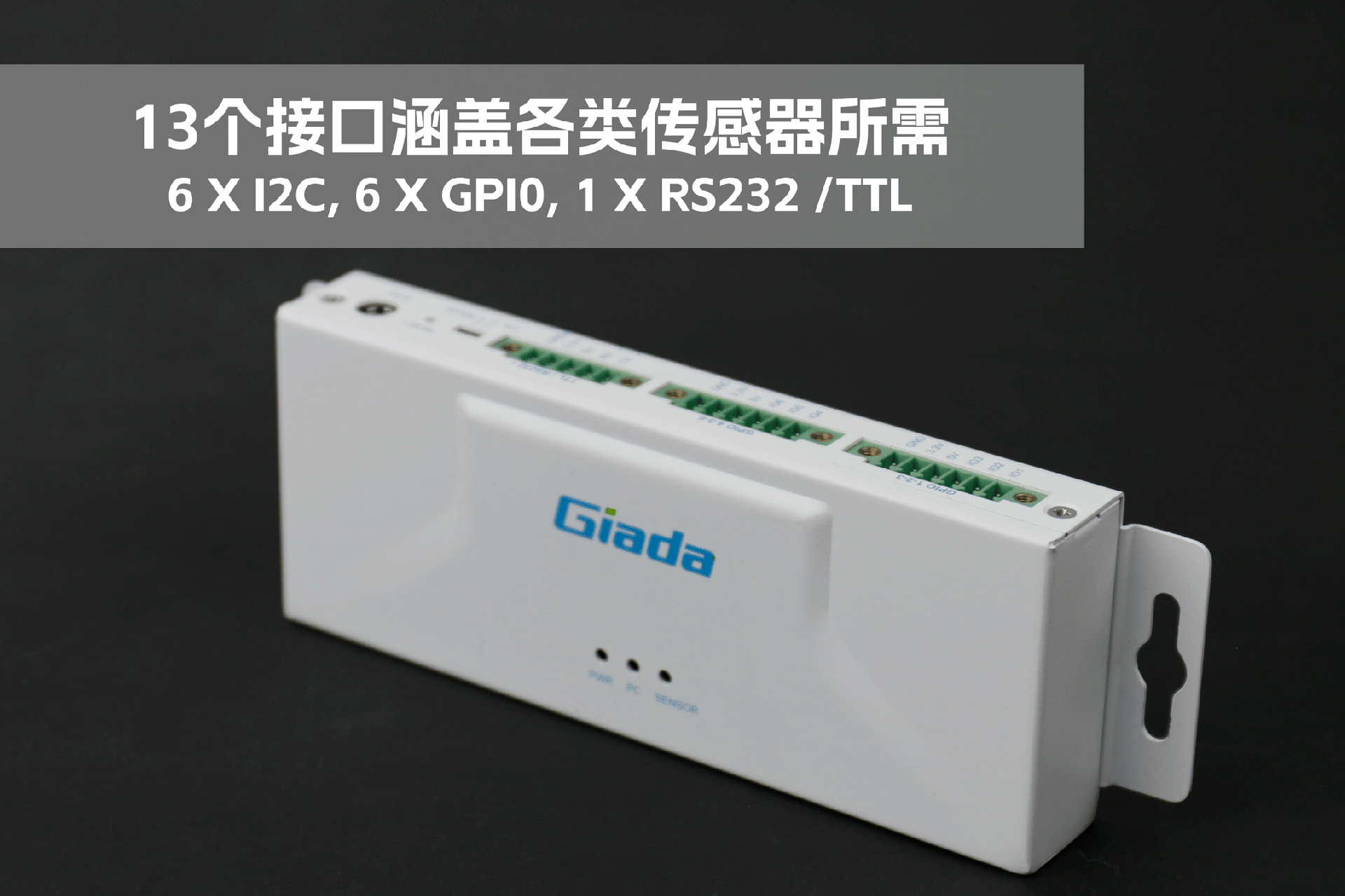 杰和RD01为满足各类传感器的连接,在正面配备1个USB Type-C接口,1个RS232 串口,6个I2C接口;背面配备6个GPI0接口,1个RS232 或 TTL(拨码开关选择),1个恢复出厂按钮,一个DC-IN圆形电源接口;在顶部设置3个LED 灯,用于状态指示。