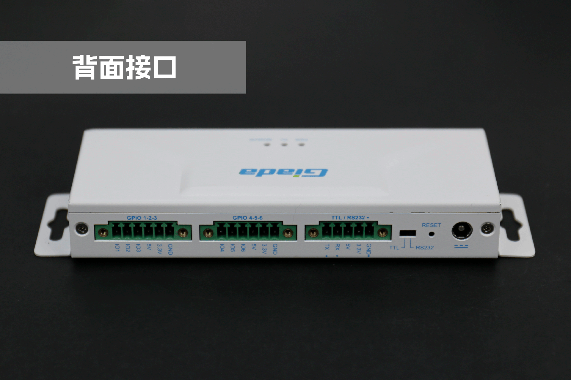 杰和RD01背面配备6个GPI0接口,采用12Pin凤端子,用于与传感器通信;1个RS232 或 TTL(拨码开关选择),采用5Pin 凤凰端子(TTL 模式下支持 5V 和 3.3V 供电),用于与传感器通讯,1个拨码开关,用于选择 RS232/TTL;1个恢复出厂按钮,用于恢复出厂设置;1个DC-IN 5V 供电接口。